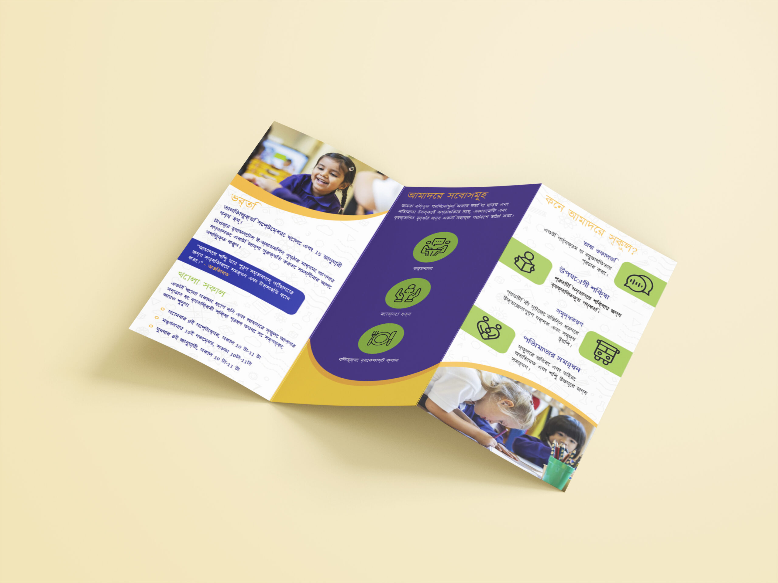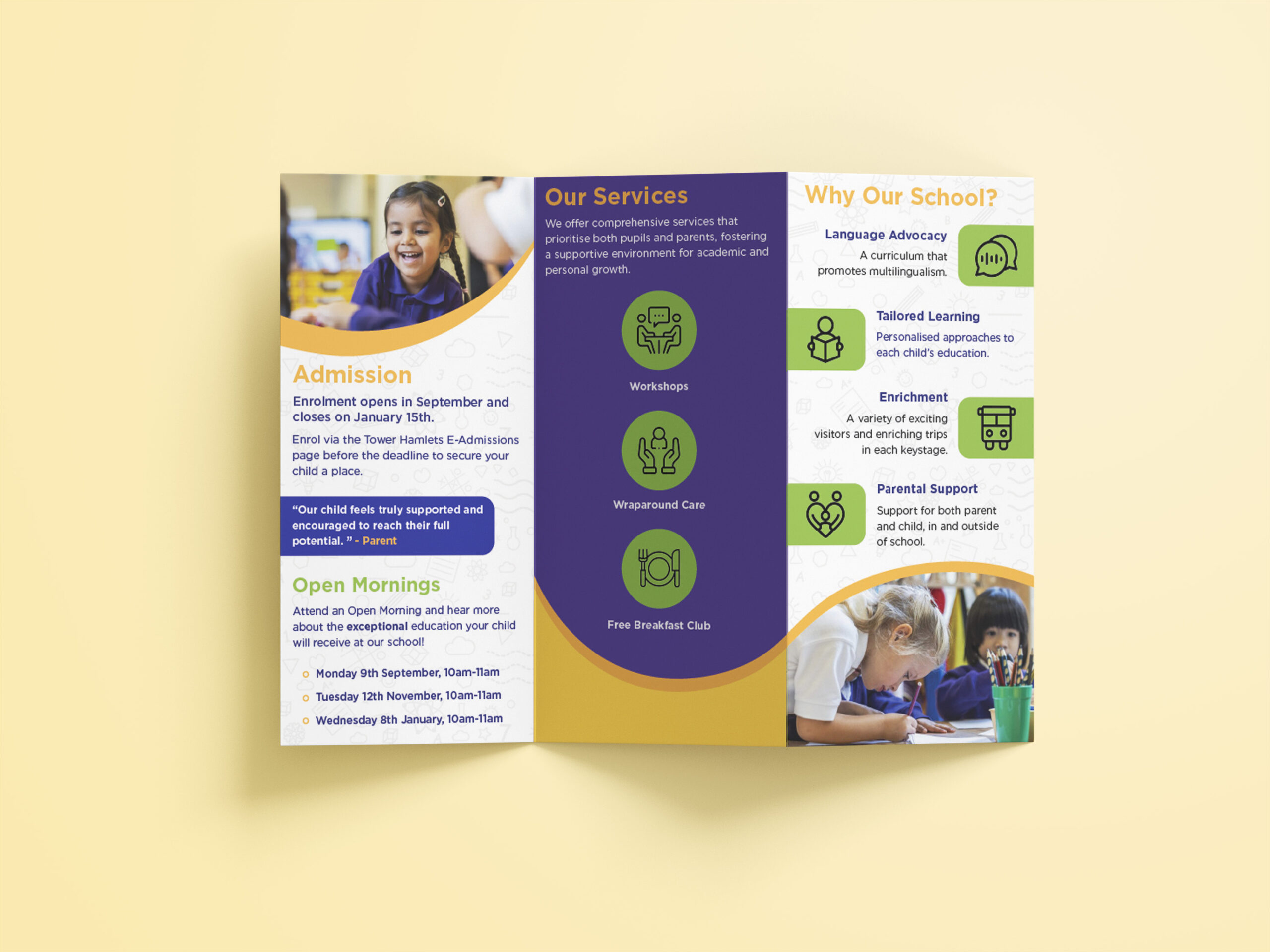 With Canon Barnett Primary joining the Mulberry Academy Trust, I was tasked with designing a range of content, of my choice, that would help them increase local enrolment and make locals aware of their ‘branding’ changes. It was highlighted that the local community was quite diverse, with a high Bangladeshi population. I incorporated Bangla in my print content to ensure I would cast as wide a net as possible.